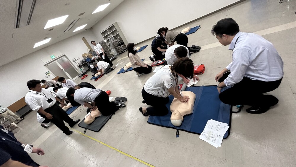 日本では、6分に1人が「心臓突然死」で亡くなられていますが、一度心肺停止状態になっても、状況によっては助けることができるそうです。その際、電気ショックを与えることが唯一の治療方法となり、電気ショックが1分遅れるごとに救命率は10%も低下していくとのことです。私たち一般市民が、初動対応として心肺蘇生法およびAEDの使用を躊躇わず、迅速に行うことで、救命率を大幅に向上させることができると学びました。